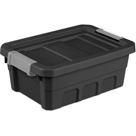 Sterilite 4-Gallon Stacker Tote, Black, 6-Pack: Sterilite stacker box with durable latchesIndexed lid for easy stackingOpaque lid and base